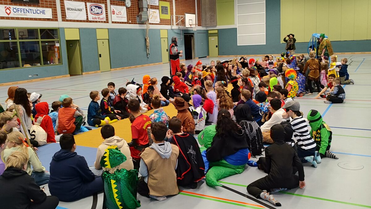 am 16.2. haben wir wieder Fasching gefeiert. Den ganzen Vormittag hatten wir viel Spaß. Zu Beginn sind wir mit einer langen Polonaise durch die Schule bis zur Sporthalle gezogen. Dort gab es einen langen Laufsteg und natürlich ganz viel Kamelle.